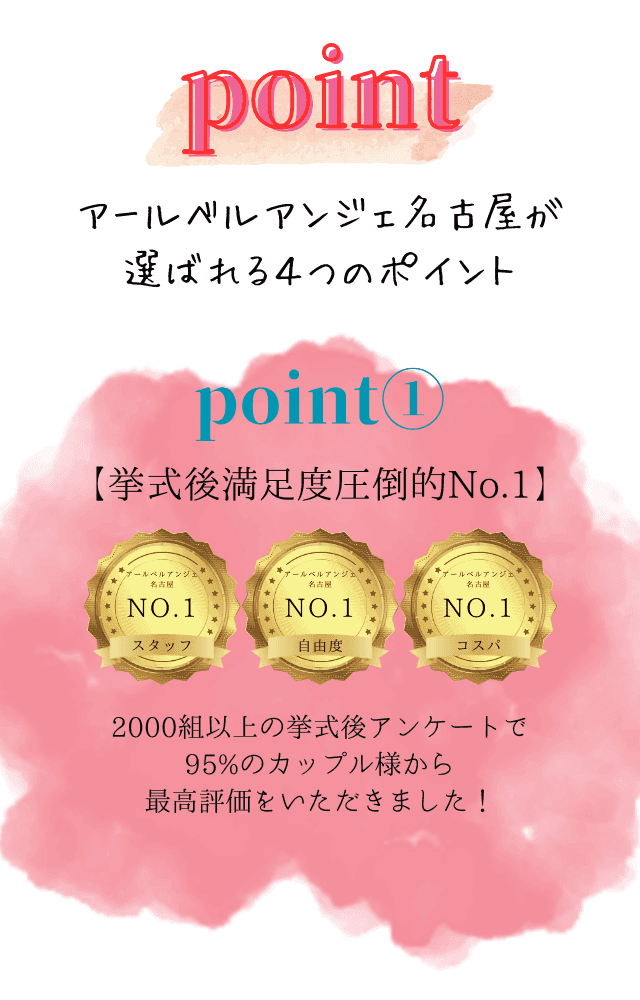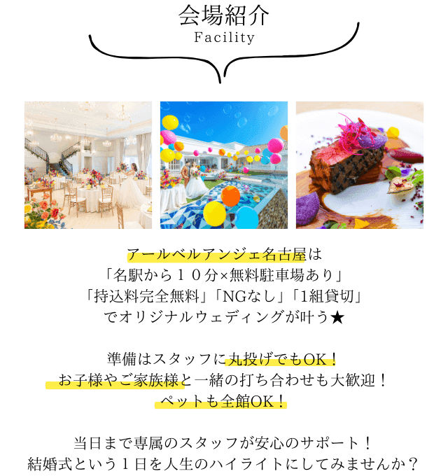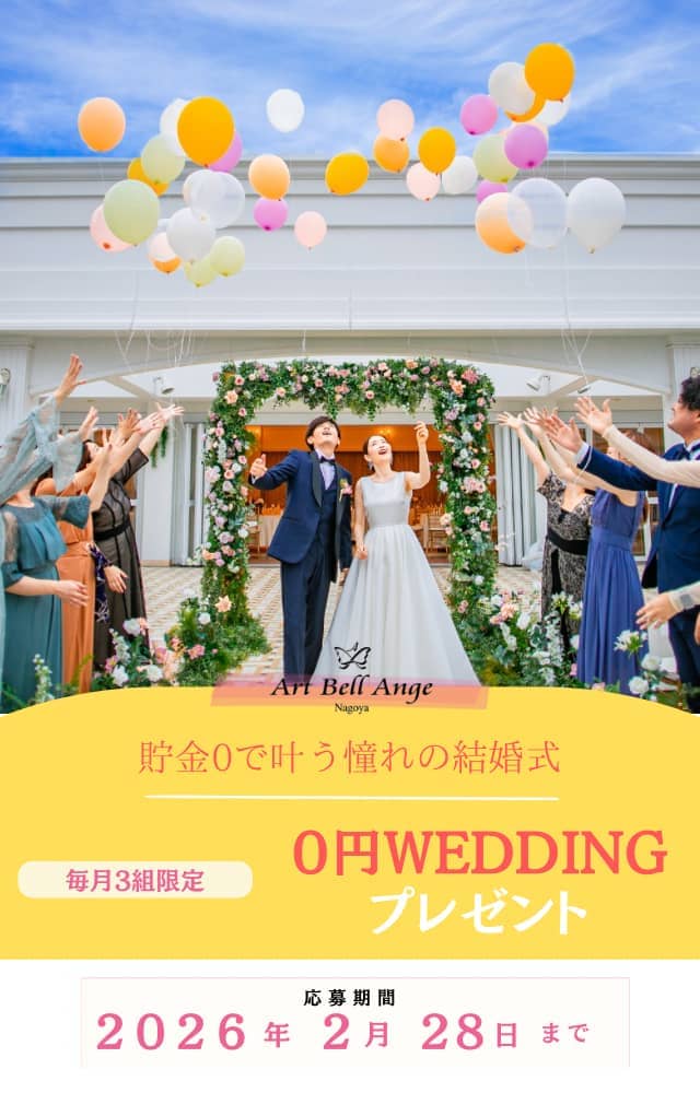 結婚式はお金がかかるからと、式を挙げる事を諦めていました。そんな時にアールベルアンジェ名古屋の「0円ウエディング」を発見しすぐに応募しました。自己負担0円でも私たちもゲストも大満足の結婚式を挙げる事ができました!お料理もとても美味しかったです・・!